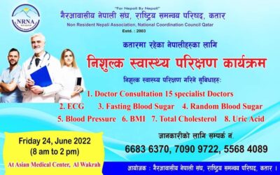 गृहपृष्ठ ∕ ग्लोबल ∕ गल्फ ∕ गैरआवासीय नेपाली संघ कतारले नि:शुल्क स्वास्थ्य परिक्षण गर्दै गैरआवासीय नेपाली संघ कतारले नि:शुल्क स्वास्थ्य परिक्षण गर्दै दीप संञ्चार जेठ २६, २०७९ गते ६:३० मा प्रकाशित गैरआवासीय नेपाली संघ,राष्ट्रिय समन्वय परिषद कतारले निस्शुल्क स्वास्थ्य परिक्षण गर्ने भएको छ।कतारमा कार्यरत नेपालीहरुको स्वास्थ्यलाई मध्यनजर गर्दै एनसिसि कतारले अगामी जुन २४ तारीख शुक्रबार एक दिन निशुल्क स्वास्थ्य परिक्षण गर्न लागेको हो ।अल वक्रा स्थित एसियन मेडिकल सेन्टरमा गरिने स्वास्थ्य परिक्षणमा १५ जना बिशेषज्ञ डाक्टरहरु सहितको टिमले स्वास्थ्य परामर्श, ब्लड प्रेसर, सुगर, कोलेस्ट्रोल, इसिजी, युरिक एसिड, बिएमआइ (उचाई र तौलको अनुपात) लगाएतका स्वास्थ्य सेवाहरु प्रदान गरिने एनआरएनए एनसीसी कतारका महासचीव पदम गिरिले बताए ।जुन २४ तारिख शुक्रबार बिहान ८:०० बजे देखि दिउँसो २:०० बजे सम्म संचालन गरिने स्वास्थ्य परिक्षणमा सहभागी भैई स्वास्थ्य लाभ लिनको लागि संघले अनुरोध गरेको छ ।क्याटेगोरी : गल्फट्याग : #breaking, #गैरआवासीय नेपाली संघ कतार तपाईको प्रतिक्रिया दिनुहोससम्बन्धित समाचारएनआरएन अध्यक्ष श्रेष्ठ र एफएनसीसीआई अध्यक्ष ढकालबीच ‘एनआरएन इन्भेस्टमेन्ट समिटबारे…नेपाली व्यवसायी संघद्वारा प्रथम सचिव कृष्ण कुमार सुवेदीलाई भव्य सम्मान…एनआरएनएको हितमा एक्लै भएपनि उभिन्छौँ – भट्टहर्मोसा ब्युटीपार्लरको दोस्रो वार्षिकोत्सव सप्पन्न धेरै पढिएका १नेपाली जनसम्पर्क समिति कतारको आयोजनामा बृहत् रक्तदान कार्यक्रम हुदै २दाङ देउखुरी सेवा समाज कतारले साताै साधारण सभा गर्दै ३प्रवासी भुजेल समाज कतारले पहिलो पटक रक्तदान कार्यक्रमको आयोजना गर्दै ४कतारमा पनि मनाइदै ३०३ औं पृथ्वी जयन्ती ५ठकुरी सहयोग संजाल कतारको आयोजनामा रक्तदान कार्यक्रम हुदै ६मगरहरुको प्रमुख राष्ट्रिय चाड माघ्या सकराटी पर्व कतारमा पनि भब्य रुपमा मनाईदै ७विकासानन्द फाउन्डेसन विश्व परिवारद्वारा कतारमा योग साधना कार्यक्रम हुदै ८पत्रकार भण्डारीको उपन्यास बोरा कतारमा बिमोचन ताजा अपडेट एनआरएनएको उच्चस्तरीय मेलमिलाप समितिमा चार सदस्य थप कतार आइपुगे पूर्व परराष्ट्र मन्त्री महत । एनआरएन अध्यक्ष श्रेष्ठ र एफएनसीसीआई अध्यक्ष ढकालबीच ‘एनआरएन इन्भेस्टमेन्ट समिटबारे छलफल ठकुरी सहयोग सञ्जाल, कतारले आफ्नो ११ औं वार्षिकोत्सव भव्य रूपमा मनाउदै नेपाली व्यवसायी संघद्वारा प्रथम सचिव कृष्ण कुमार सुवेदीलाई भव्य सम्मान तथा बिदाइ गैरआवासीय नेपाली संघको उपाध्यक्षमा श्रेष्ठ, निरन्तर योगदान र नेतृत्व क्षमतामा सधैं अब्बल एनआरएनएको एकता महाधिवेशन गर्ने बाटो खुला, शनिबार हायात होटेलमा उद्घाटन ह