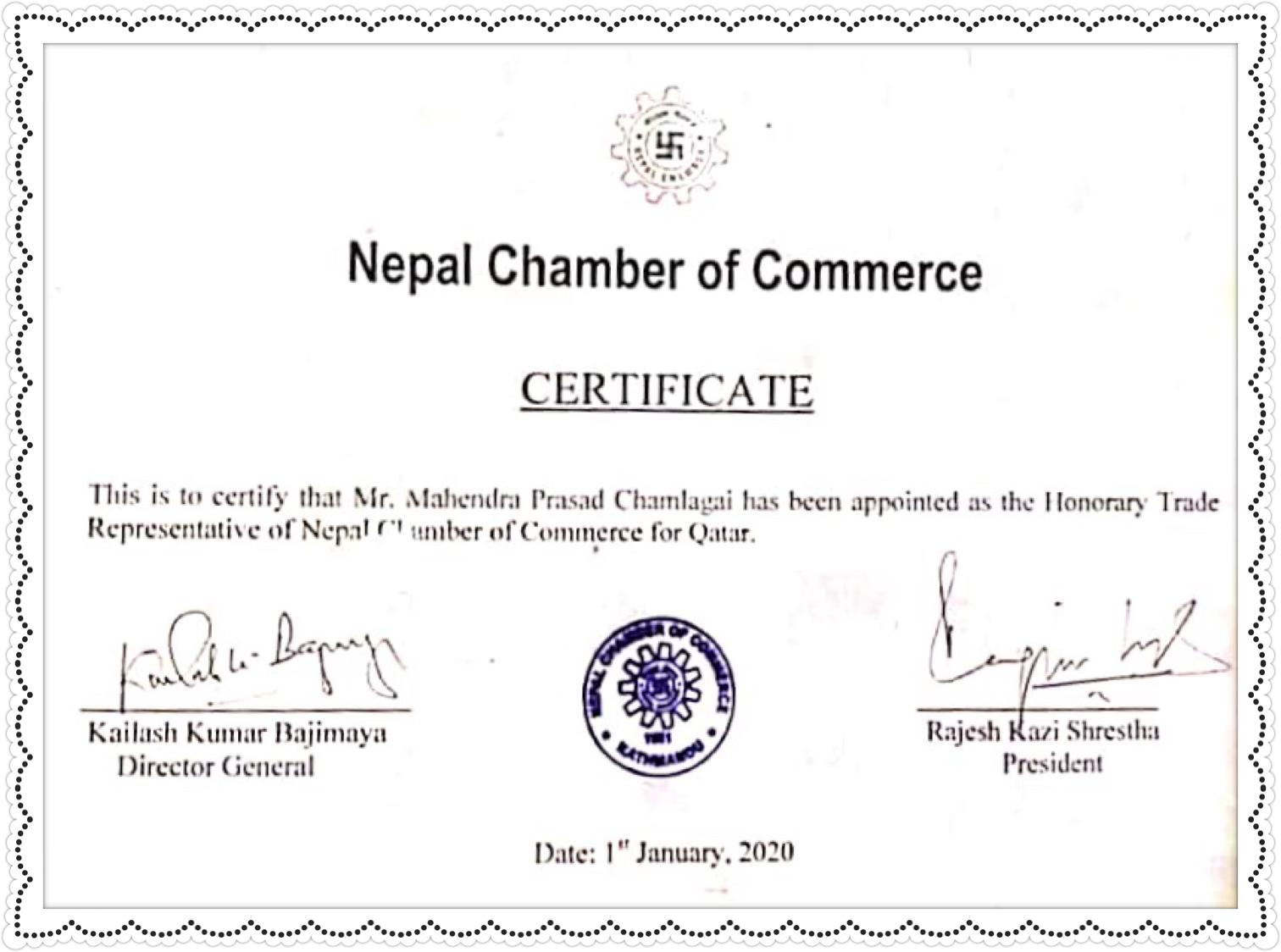 गृहपृष्ठ ∕ समाचार ∕ नेपाल चेम्बर अफ कमर्सको कतार प्रतिनिधिमा चौलागाई नियूक्त नेपाल चेम्बर अफ कमर्सको कतार प्रतिनिधिमा चौलागाई नियूक्त दीप जङ्ग शाह पुस १९, २०७६ गते १६:४६ मा प्रकाशित दोहा – नेपाल चेम्बर अफ कमर्सको कतार प्रतिनिधिमा नेपाली व्यवसायी संघ कतारका अध्यक्ष महेन्द्र चौलागाई नियुक्त भएका छन् ।नेपाल चेम्बर अफ कमर्सका अध्यक्ष राजेशकाजी श्रेष्ठले बिहीबार चौलागाईलाई कतार प्रतिनिधिको प्रमाणपत्र (अनररी ट्रेड रिप्रिजेन्टिभ सर्टिफिकेट) हस्तान्तरण गरेका हुन् । नेपाल र कतारका व्यवसायीहरुबीच सम्बन्ध स्थापित गर्नुका साथै कतारी व्यवसायीहरुको लगानी स्वदेशमा ल्याउनका लागि चौलागाईको नियुक्तिसँगै सहज हुने अपेक्षा गरिएको चेम्बर अफ कमर्सले जनाएको छ ।नेपाल चेम्बर अफ कमर्स समग्र नेपाली व्यवसायीहरुको साझा संस्था हो । यसले नेपाली व्यवसायी तथा व्यापार विस्तारमा सहजीकरण गर्दै आएको छ । दुई वर्ष अगाडि कतारमा व्यवसाय गरिरहेका नेपाली व्यवसायीहरु संगठित भएर नेपाली व्यवसायी संघ कतारको स्थापना गरेका थिए ।कतारमा रहेका व्यवसायी र नेपालका व्यवसायीहरुबीच पुलको काम गर्नका लागि अव धेरै सहज हुने अध्यक्ष चौलागाईले बताए । उनले भने, ‘नेपालका व्यवसायी र कतारी व्यवसायीसँगको सम्बन्ध स्थापित गर्न अबबाटो खुलेको छ ।’प्रमाणपत्र हस्तान्तरणमा संघका सचिव उमेश अधिकारीको पनि उपस्थिती रहेको थियो । नेपाली व्यवसायी संघले आगामी जनवरी ३१ मा पहिलो महाधिबेशन गर्दैछ ।क्याटेगोरी : समाचारट्याग : #breaking तपाईको प्रतिक्रिया दिनुहोससम्बन्धित समाचारएनआरएनएको उच्चस्तरीय मेलमिलाप समितिमा चार सदस्य थपकतार आइपुगे पूर्व परराष्ट्र मन्त्री महत । एनआरएन अध्यक्ष श्रेष्ठ र एफएनसीसीआई अध्यक्ष ढकालबीच ‘एनआरएन इन्भेस्टमेन्ट समिटबारे…ठकुरी सहयोग सञ्जाल, कतारले आफ्नो ११ औं वार्षिकोत्सव भव्य रूपमा… धेरै पढिएका १नेपाली जनसम्पर्क समिति कतारको आयोजनामा बृहत् रक्तदान कार्यक्रम हुदै २दाङ देउखुरी सेवा समाज कतारले साताै साधारण सभा गर्दै ३प्रवासी भुजेल समाज कतारले पहिलो पटक रक्तदान कार्यक्रमको आयोजना गर्दै ४कतारमा पनि मनाइदै ३०३ औं पृथ्वी जयन्ती ५ठकुरी सहयोग संजाल कतारको आयोजनामा रक्तदान कार्यक्रम हुदै ६मगरहरुको प्रमुख राष्ट्रिय चाड माघ्या सकराटी पर्व कतारमा पनि भब्य रुपमा मनाईदै ७विकासानन्द फाउन्डेसन विश्व परिवारद्वारा कतारमा योग साधना कार्यक्रम हुदै ८पत्रकार भण्डारीको उपन्यास बोरा कतारमा बिमोचन ताजा अपडेट एनआरएनएको उच्चस्तरीय मेलमिलाप समितिमा चार सदस्य थप कतार आइपुगे पूर्व परराष्ट्र मन्त्री महत । एनआरएन अध्यक्ष श्रेष्ठ र एफएनसीसीआई अध्यक्ष ढकालबीच ‘एनआरएन इन्भेस्टमे